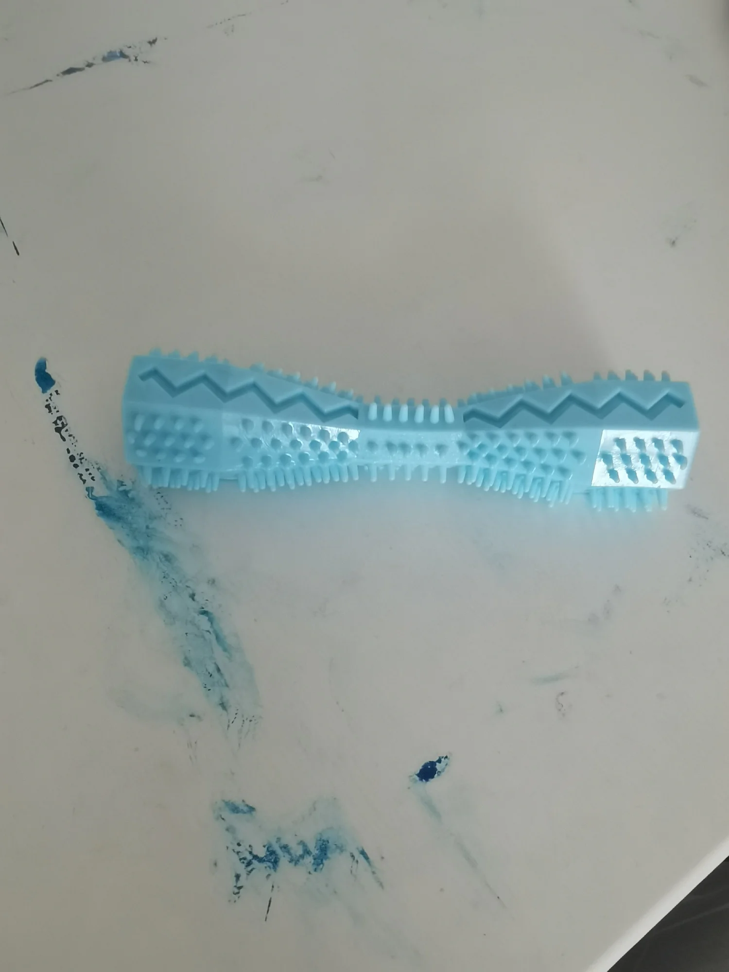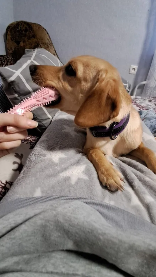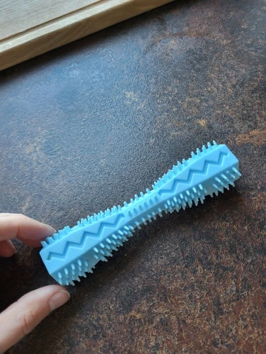 Das Spielzeug des Hundes gefiel mir, nach 2 Wochen war sie immer noch sicher, dass die Seltenheit für uns die Zähne etwas beruhigt hat. auf einer Seite geräuchtes Silikon